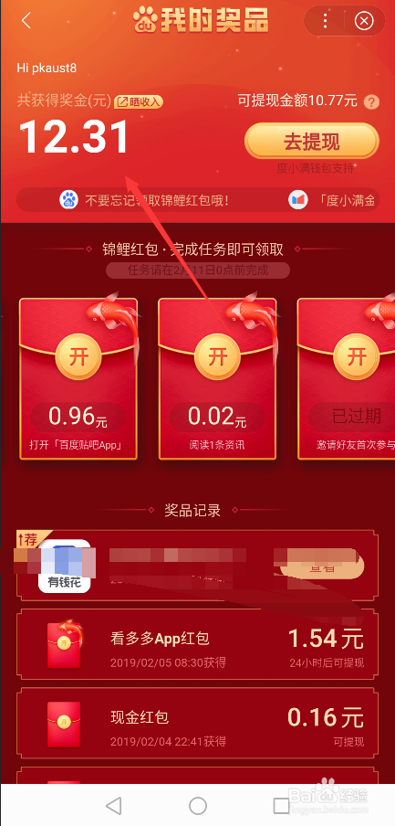 进入百度我的奖品界面后,鄙人面就可以看到锦鲤红包,完当作使命即可领取,直接点击下面的使命红包就可以了,如下图所示。
