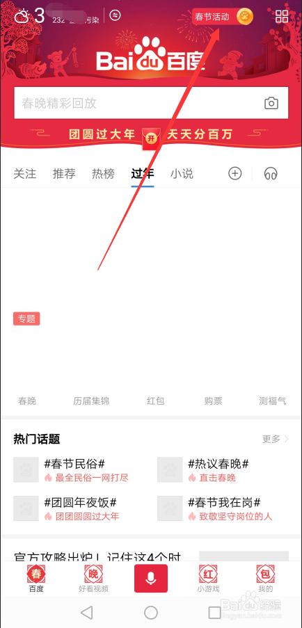 打开百度APP后,直接点击右上角的【春节活动金币】图标,如下图所示。