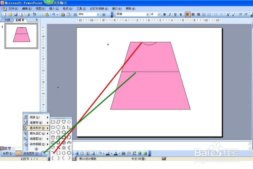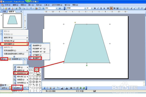 首先打开PPT2003,把编纂界面的内容都删除失落,然后点击自选图形——根基外形——梯形,然后再点击画图——扭转或翻转——垂直翻转。
