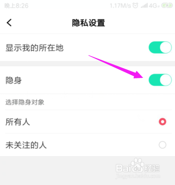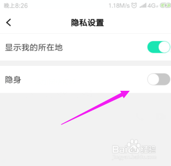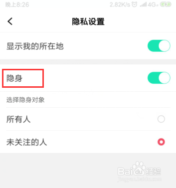 【隐私设置】快速的点按开之后,【隐身】是没有开启的,如图。