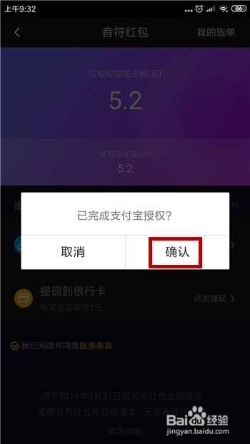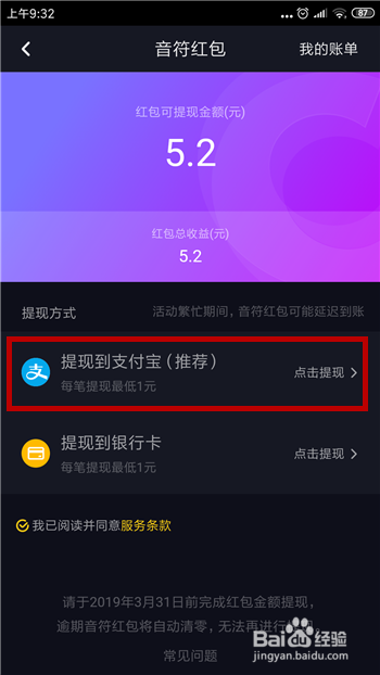 打开钱包界面后即可看到我们收到的音符红包,提现有两种体例,第一种是付出宝,第二种是银行卡,小编以付出宝为例,点击【提现到付出宝】。