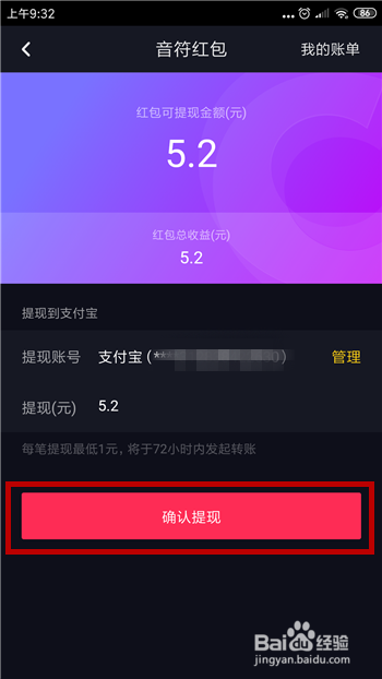 返回到提现界面后可看到我们的提现账号以及提现金额,点击【确认提现】。