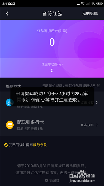 点击后会提醒我们申请提现当作功,因为人多我们需要耐烦期待一会。