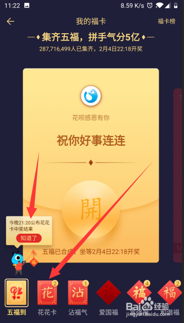 此时进入之后,首先呈此刻我们面前的是一个五福到的卡片,申明你已经集齐了五福,此时在左下方区域可以看到提醒,今晚21:20发布花花卡开奖。