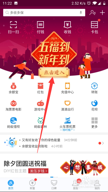 在付出宝首页中,我们可以看到上方区域的付出宝集五福进入进口,此时点击如图所示的,进入付出宝集五福