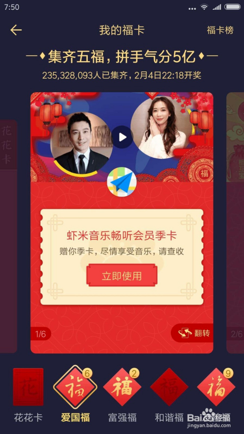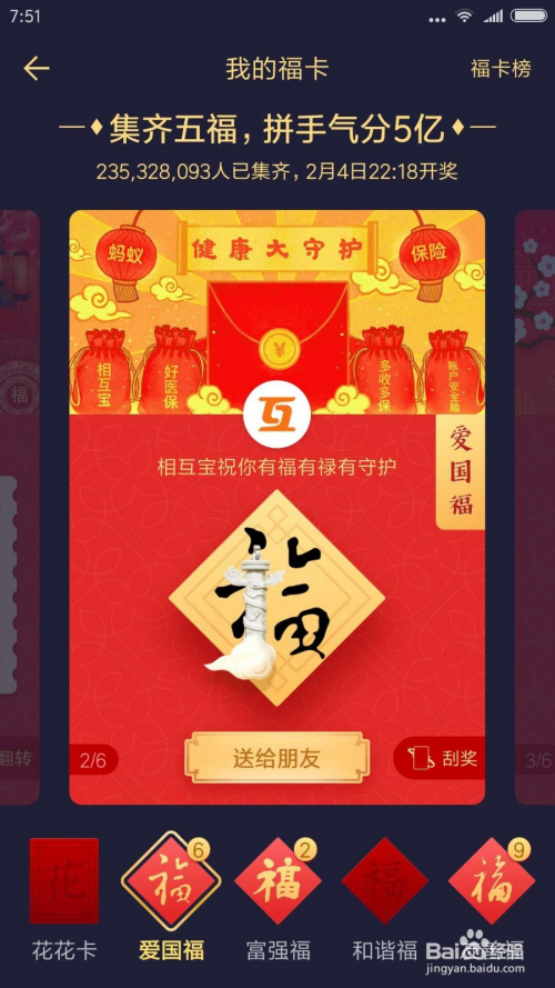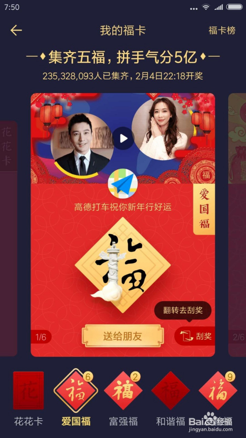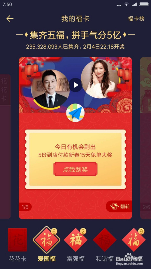 在我的福卡页面,我们可以看到本身获得的所有福卡,我们随便选择一张,然后点击卡片右下角的“刮奖”。