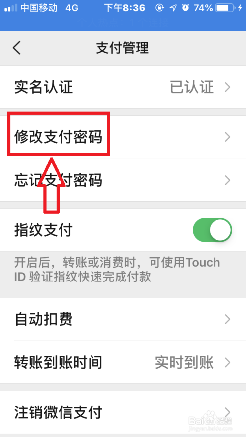 - 进入“付出办理”页面,点击“点窜付出密码”,输入并确认新密码即可。