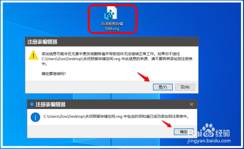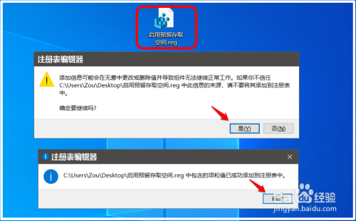 我们在系统桌面上找到并左键双击【启用预留存取空间.reg】注册表文件图标,在先后弹出的注册表编纂器对话框中,点击:是(Y)和确定;