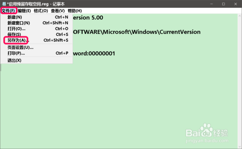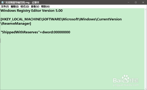 我们按照建造【启用预留存取空间.reg】文件的方式,建造一个【封闭预留存取空间.reg】的注册表文件添加到注册表中。