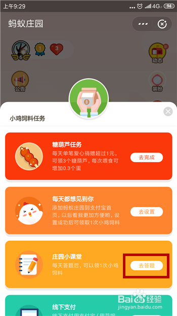 在领饲料使命中找到【庄园小讲堂】并点击此中的【去答题】。