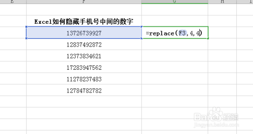 继续输入“,"****"” 即整条函数为=REPLACE(F3,4,4,"****")