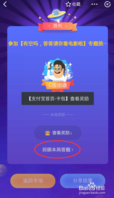 获得的奖品可以从首页的“卡包”查看,点击【回首本局答题】