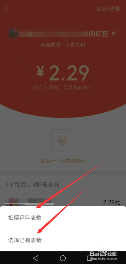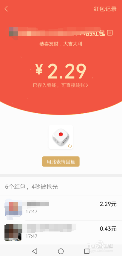 在领取红包界面里的金额下面就会有个【答复一个脸色到聊天】,直接点击,如下图所示。