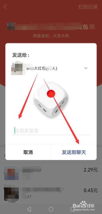 选择好微信红包答复脸色后,直接点击下面的【发送到聊天】,如下图所示。