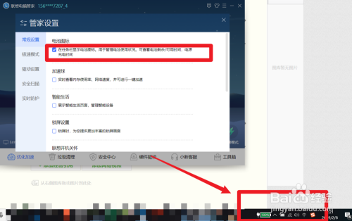 第六步,点击常规设置之后,然后点击右边电池图标下方的框框,就把电池图标选择上了,没有选择之前,我们是看不到电池信息,如图一所示,选择之后,我们就可以看到电池信息了,如图二所示。