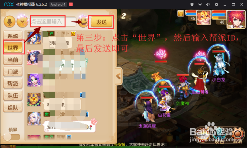 步调三:打开聊天界面今后,点击“宿世界”一栏。该栏发送聊天信息,当前办事器的玩家都可以看的到。如许等需要插手帮派的玩家点击插手。帮派办理赞成即可。