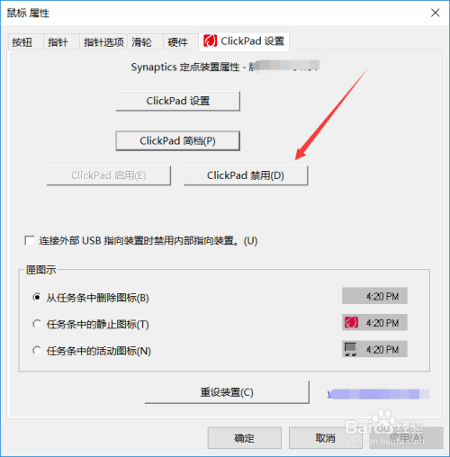 在ClickPad设置选项卡下面直接点击【ClickPad禁用】按钮,如下图所示。