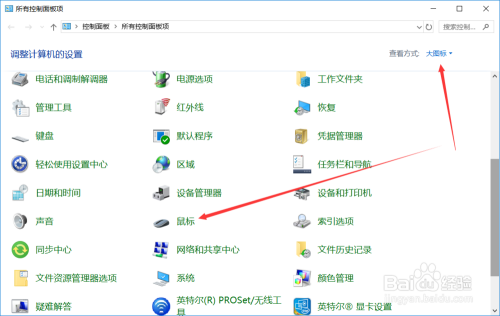 进入win10节制面板后,先点击右上角的下拉框选择查看体例为【年夜图标】,然后在找到【鼠标】选项,如下图所示。