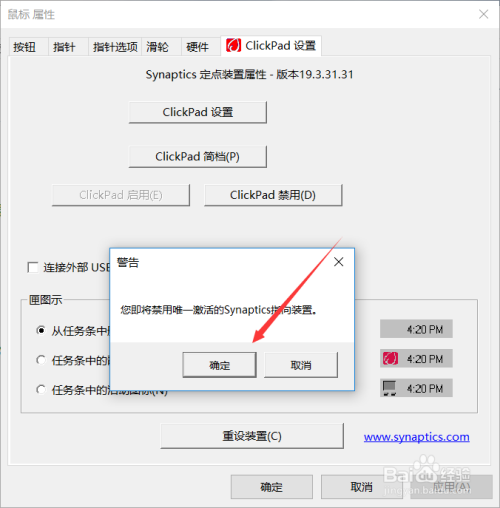 点击后,win10系统弹出禁用触控板的提醒信息,直接点击【确定】,如下图所示。