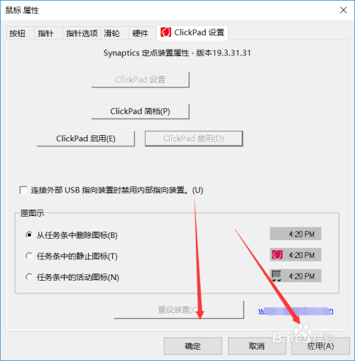 将ClickPad设置为禁用后,直接点击下面的【应用】和【确定】,如下图所示。