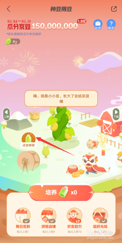获得营养液后直接点击营养液就可以给京豆树苗浇水了,如下图所示。
