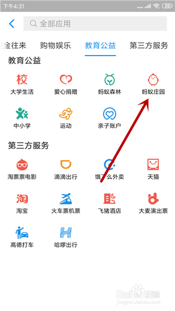接着在应用里点击教育公益下方的【蚂蚁庄园】。