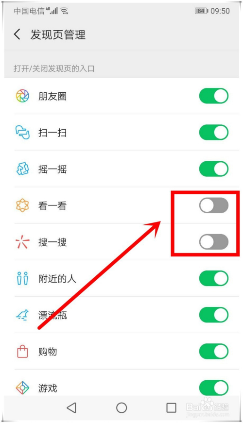 进入后,可以在此中看到所有发现页中显示的选项,点击后面的开关,打开或开关,即可让该选项在发现页中显示或埋没。