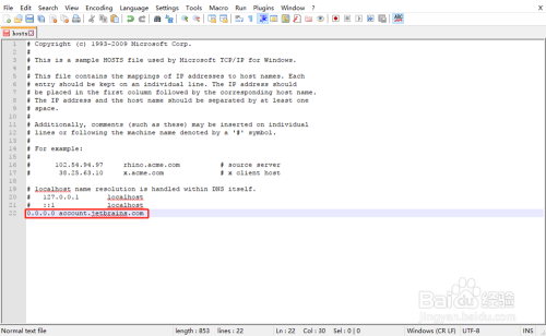 找到 C:\Windows\System32\drivers\etc 下的hosts文件,利用第三方编纂器进行编纂,将“0.0.0.0 account.jetbrains.com”内容插手文件末从头至尾并保留。