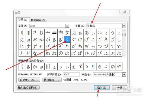在“子集”中选择“平化名”,并鄙人方选中平化名く,点击“插入”。