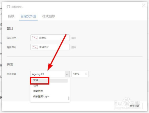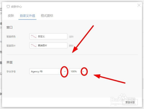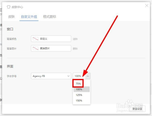 在“设置中间”,选择“界面”下的“皮肤和外不雅设置”单击