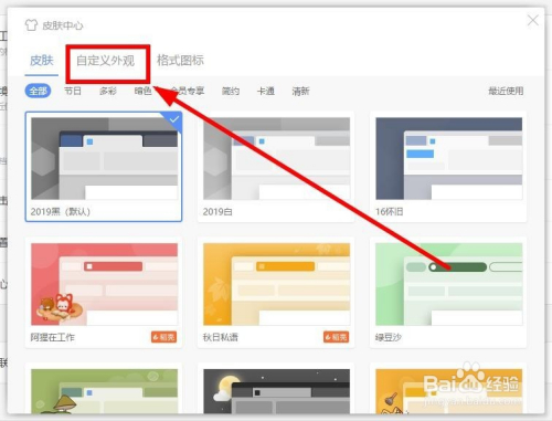 在“皮肤中间”对话框,找到“自界说外不雅”选项卡单击