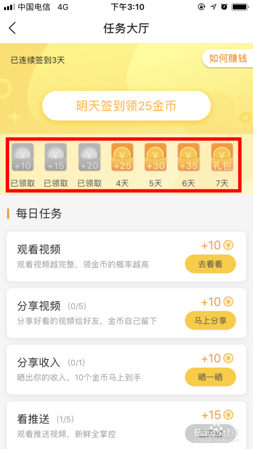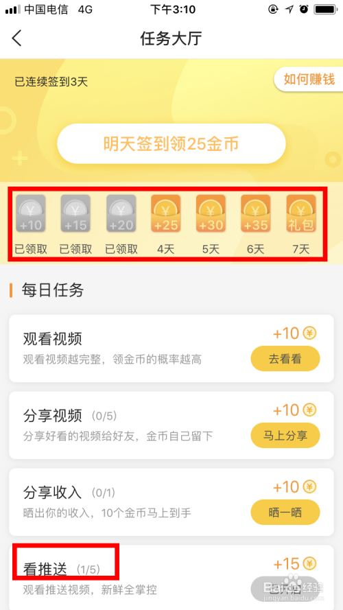 每看一个推送视频,可以赚取15金币,天天最多看五次。