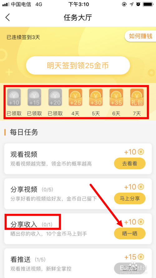 进入 使命大厅 ,在 每日使命下面找到 分享收入 ,点击后面的 晒一晒 。