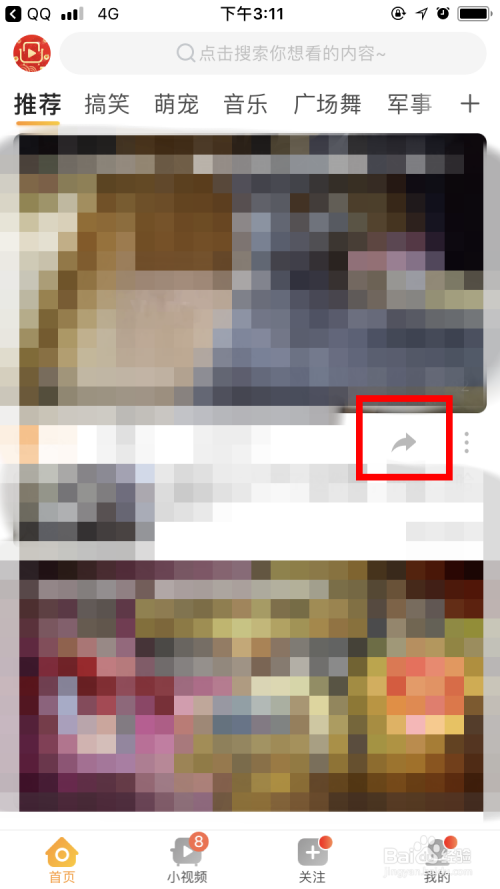 回到首页面后,点击某个视频下面的分享图标(下图红色方框中的图标)。
