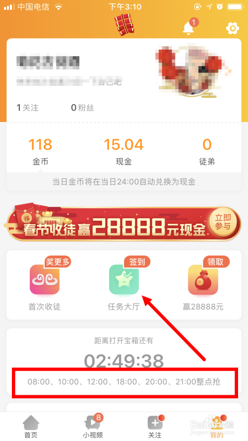 进入 小我页面后 ,就可以看到天天有六个时候点:8:00、10:00、12:00、18:00、21:00,进入该页面就可以开宝箱赚钱金币。