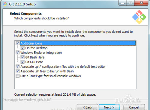 勾选建立桌面快捷体例、Git Bash、Git GUi、已经目次和后缀联系关系等,如下图所示: