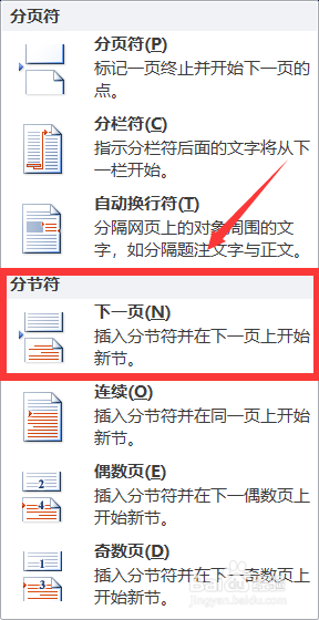 操作三:点击插入分页符和分节符选项框,找到下方的分节符点击插入分节符,操作图片步调如下。