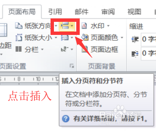 操作二:进入页面结构后,点击页面设置让后点击,插入分页符和分节符,点击竟如,操作图片步调如下。