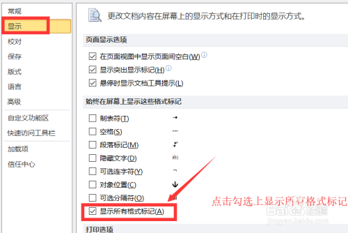 操作六:点击选择进入文件点击进入选项,选项点击进入显示选项卡,勾选上点击显示所有格局标识表记标帜,操作图片步调如下。