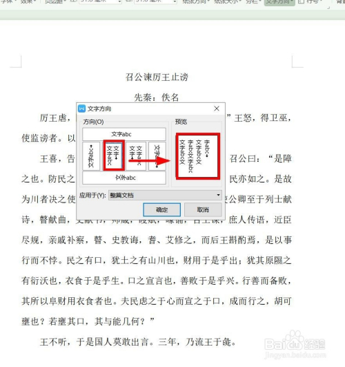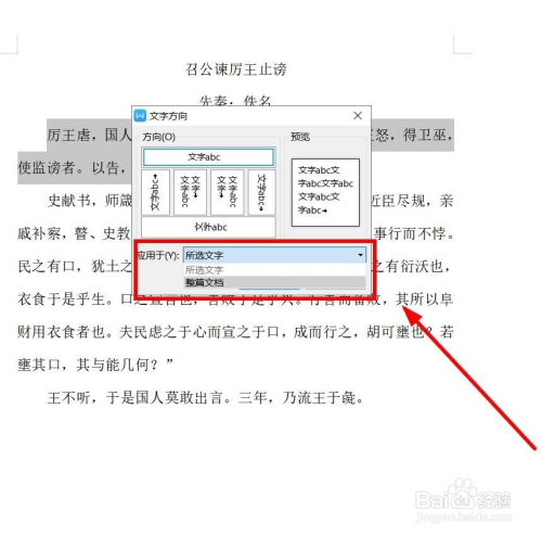 若是想要部门文字竖排,可以选中这些文字后,就有了“整篇文档”和“所选文字”两种选项,选择完当作后,单击“确定”就可以了