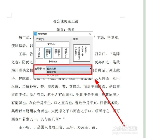 单击“应用于”后面的箭头,可以进行“正篇文档”和“插入点之后”两种体例的竖排设置