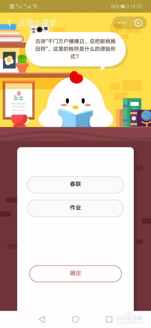 千门万户曈曈日,总把新桃换旧符。夏历新年的时辰家家户户城市贴对联,今天我们经由过程付出宝蚂蚁丛林来答这道题领取小鸡饲料吧!