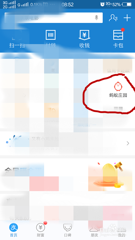 首先我们点击我们手机桌面上的付出宝,进入付出宝的首页,然后我们点击我们的蚂蚁庄园,进入蚂蚁庄园。