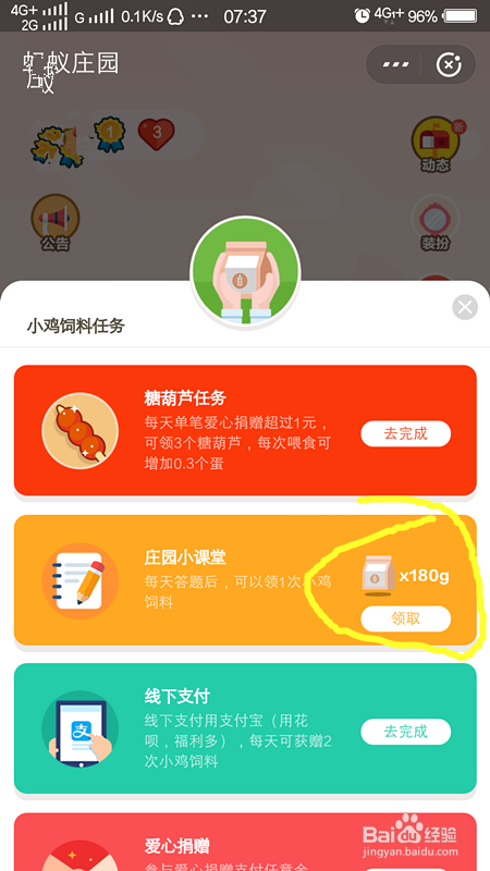 我们点击领取之后,点击下方的饲料,就可以喂养我们的小鸡了。