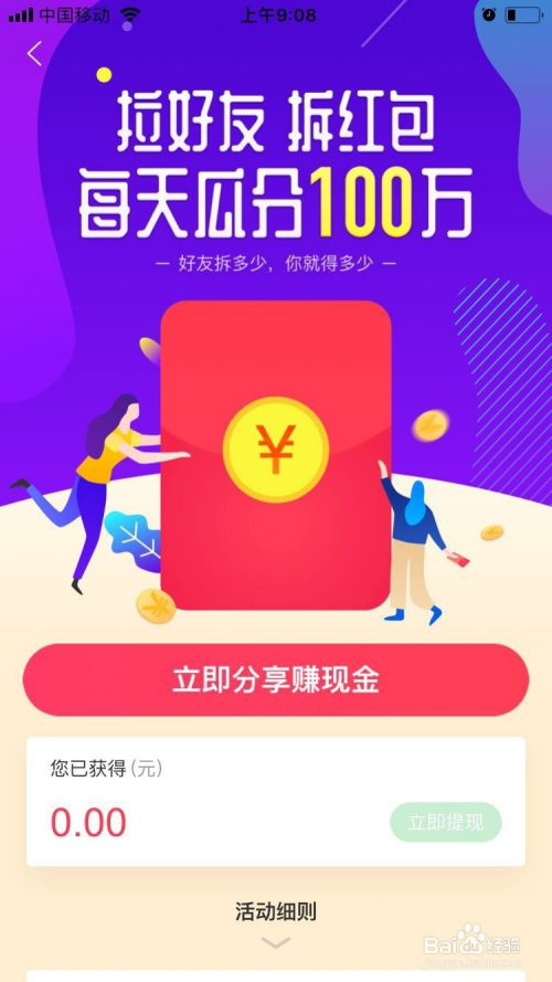 每日拉老友拆红包获得分红:在百度知道APP内点击”当即分享赚现金“,分享链接给老友,老友点击即可拆红包,老友拆几多,本身就可以获得几多。