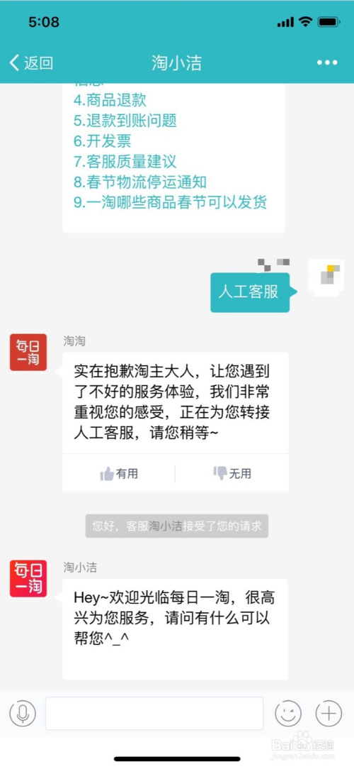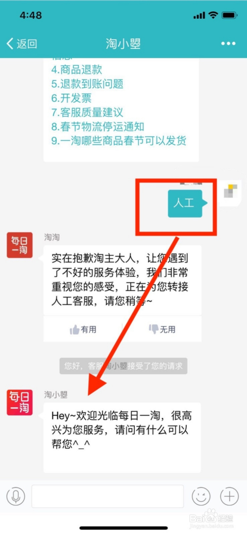 第五步:若是以上都不克不及解决你的问题,在客服处答复“人工”或者“人工客服”都可以唤出每日一淘的人工客服。
