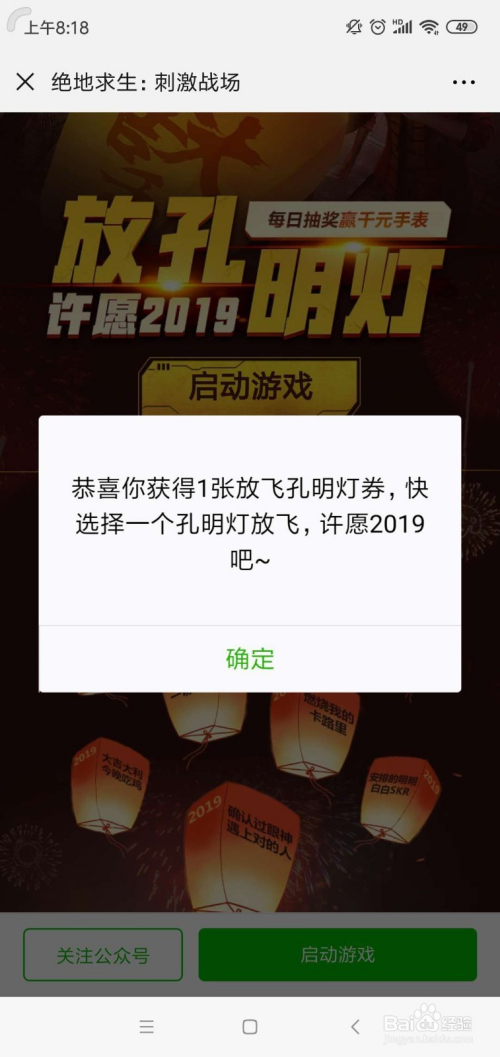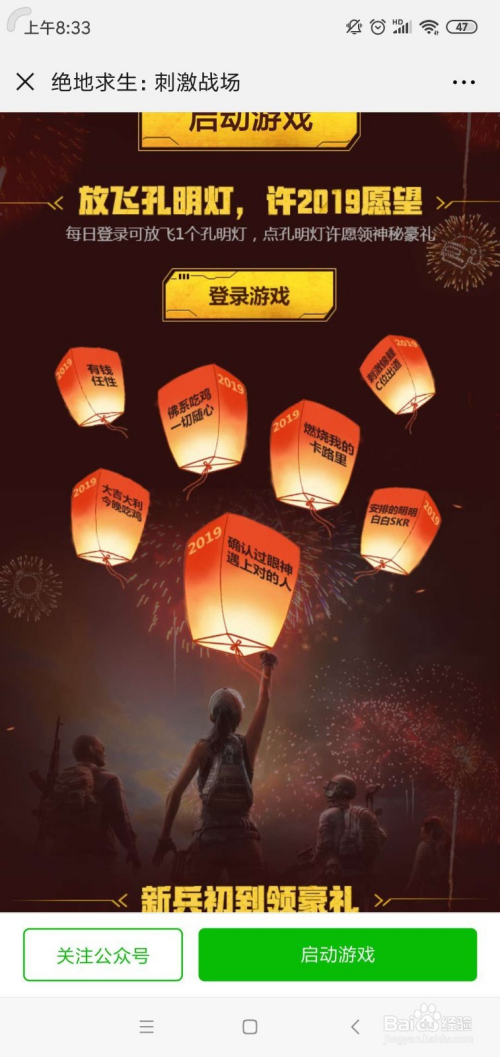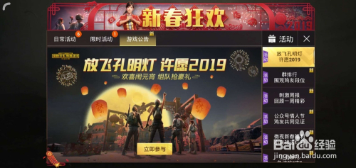 点击“游戏通知布告”,看到“放飞孔明灯,许愿2019”,我们点击当即介入;