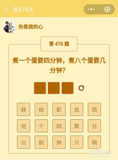 第476关谜底是四分钟。