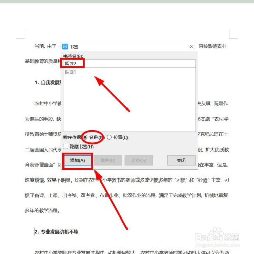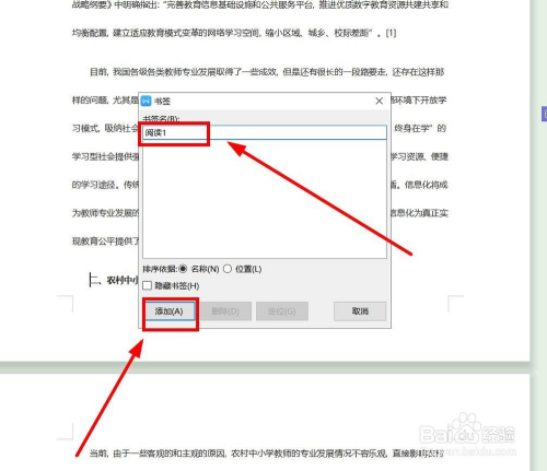 在弹出“书签”对话框中,输入书签名字后,单击“添加”