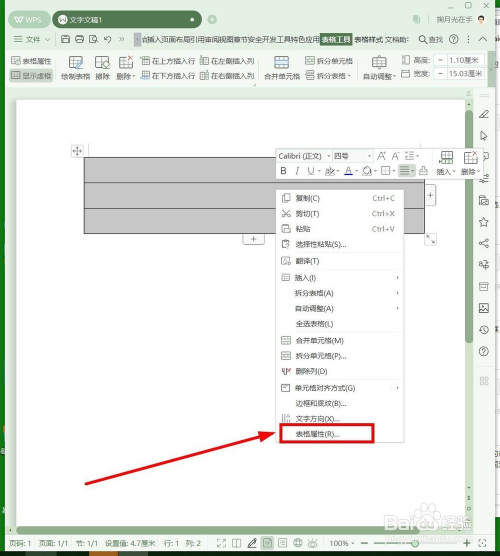 将插入的表格全选,然后鼠标右键,选择“表格属性”单击
